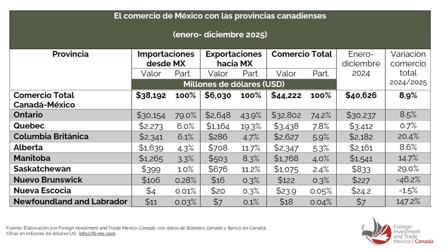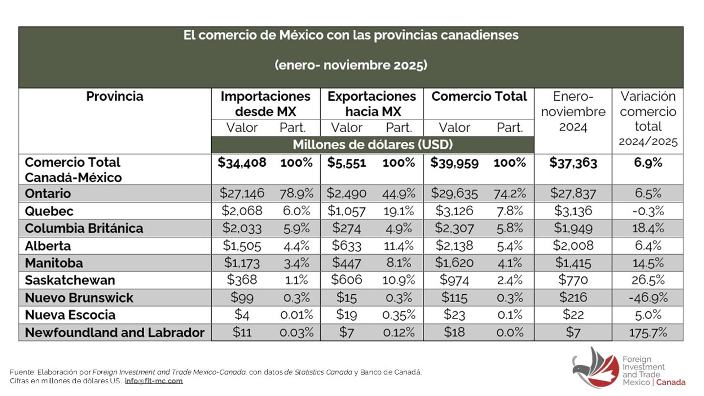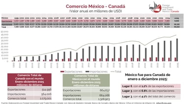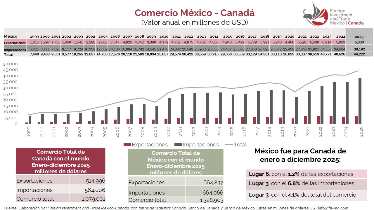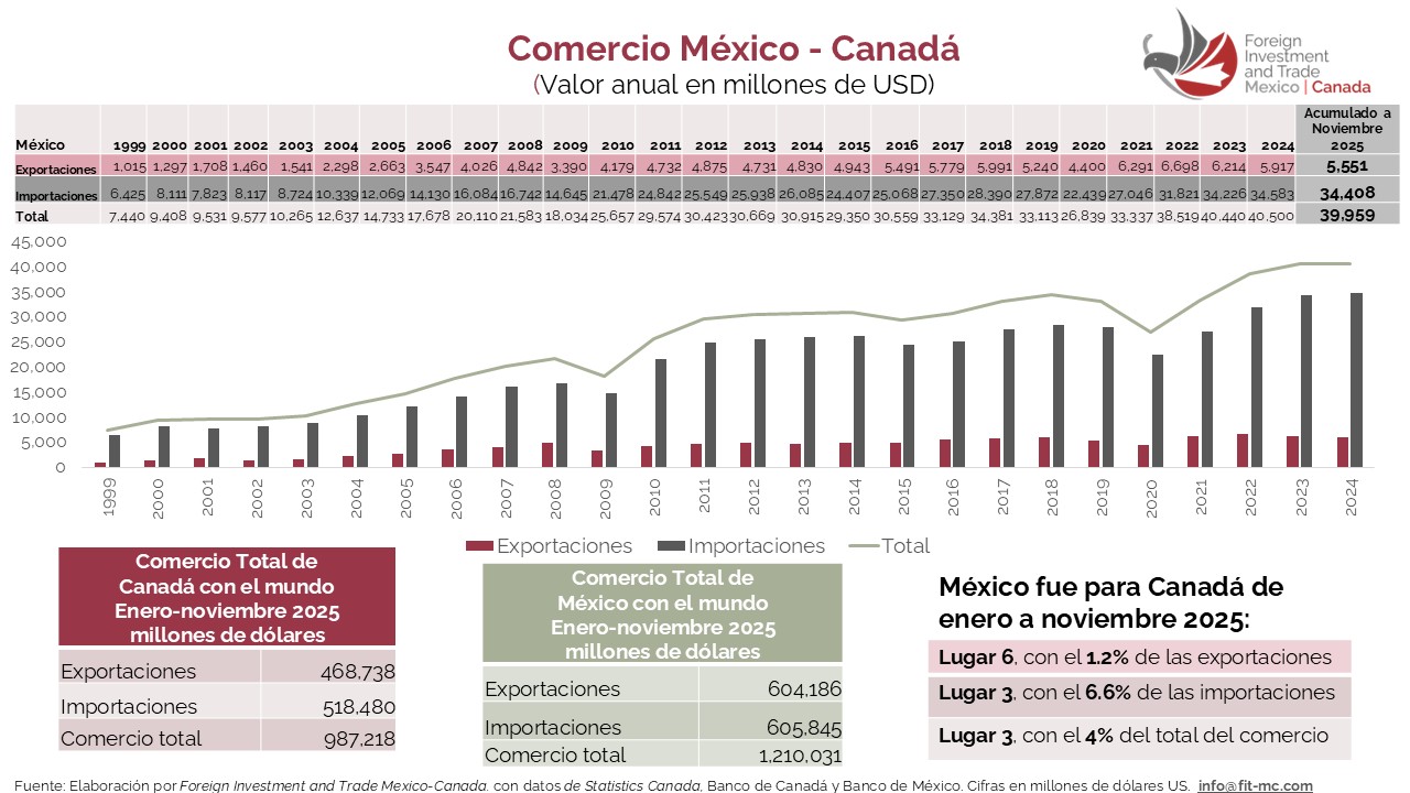México es el tercer socio comercial de Canadá, mientras que Canadá se ha posicionado como el segundo destino de las exportaciones mexicanas; sin embargo, ambos países están altamente integrados comercialmente con los Estados Unidos.