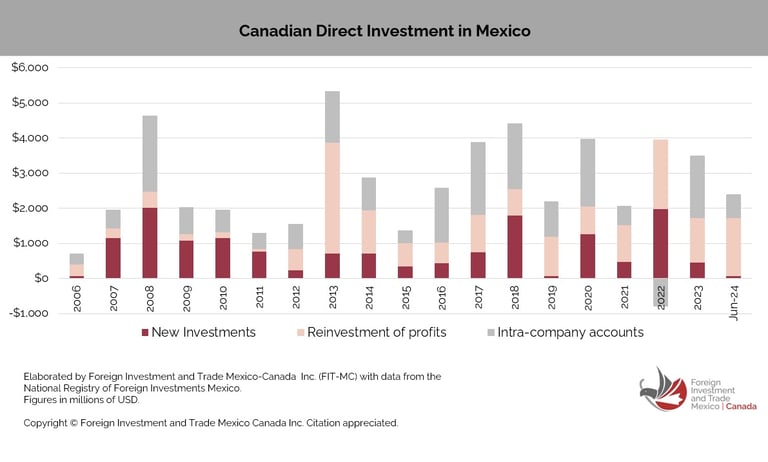 New investments tend to be the largest component most years, except for periods where reinvestment of profits or intra-company accounts contribute significantly, such as in 2013 and 2022.
